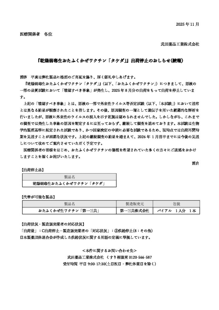 おたふくかぜワクチン(乾燥弱毒性おたふくかぜワクチン「タケダ」)出荷停止のため、